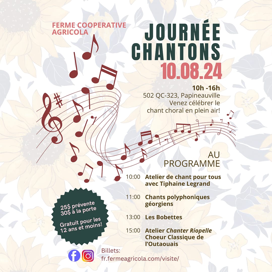 Venez apprendre des chansons, participer à des ateliers et vous laissez bercer par les mélodies d’ensembles vocaux de la région dans l’espace enchanteur de la Ferme Agricola!